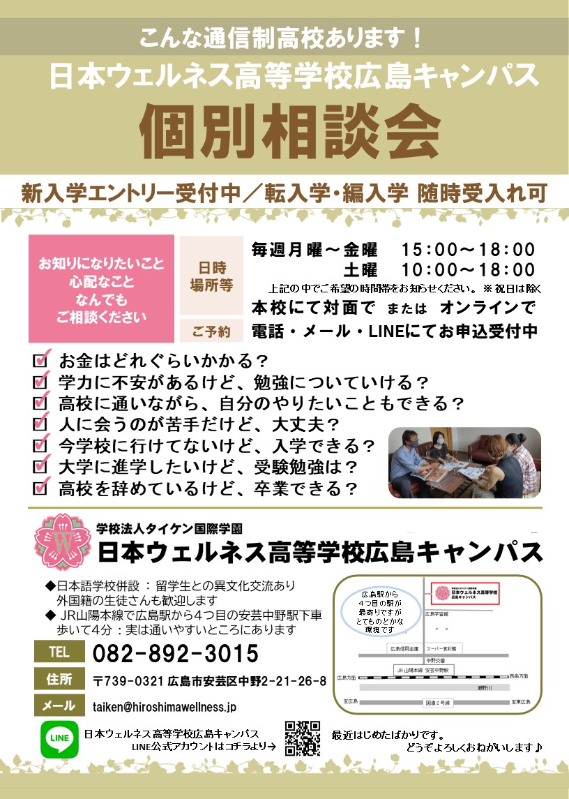 広島で通信制高校への転校なら、日本ウェルネス高校。島根県・岡山県からも。