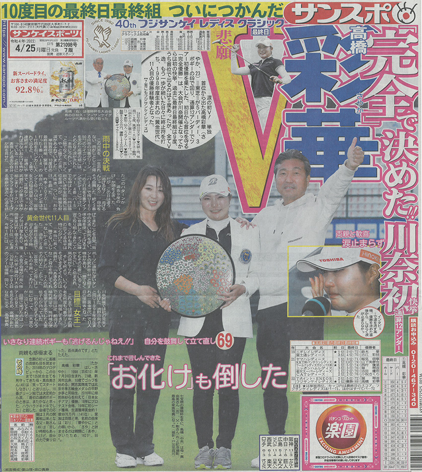 4月24日(日)に行われた「フジサンケイレディス クラシック」で、日本ウェルネススポーツ大学3年高橋彩華さん(東芝)が見事、初優勝を飾りました!